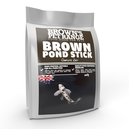 Full Description: Our Brown Stick diet is simple yet contains all the essential vitamins and nutrients needed to give your pond fish a happy yet healthy life. Also containing high protein pellets which helps with growth of growing fish & keeping a stable growth & high activity levels in adult fish. Brown Stick is suitable for all pond fish.