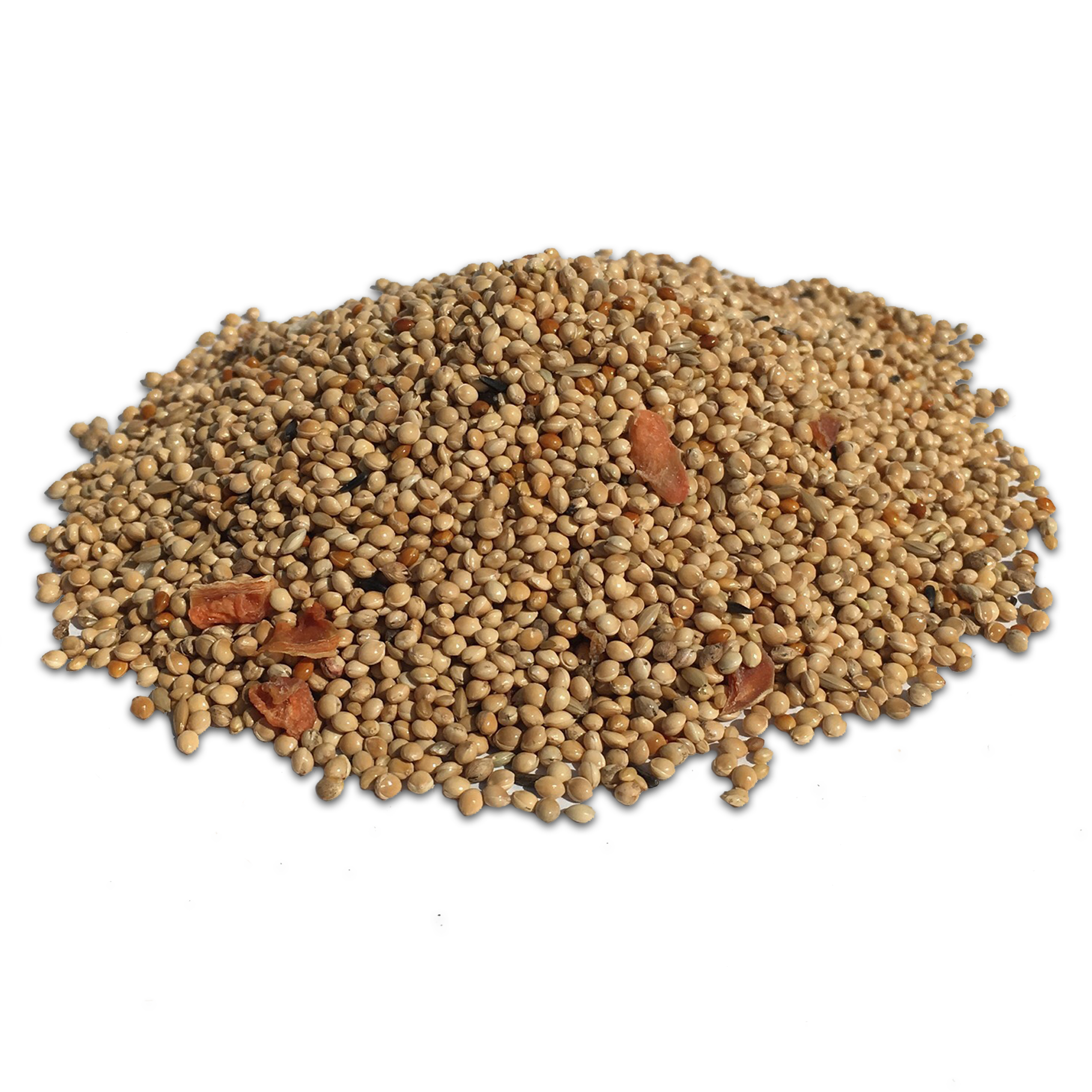 The inclusion of millets in this diet is very beneficial for your budgie. Silica, which is found in millet; is important for the development & strengthening of budgies bones, ligaments & other body systems. Canary Seed is high in protein yet low in fat which can help with the removal of excess fat & birds that gain weight easy. Hempseed also offers its benefits, offering an extra energy boost. Nyger seed is full of energy & will boost a finches activity levels for more flying & playing!