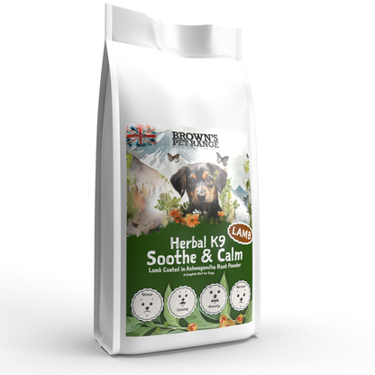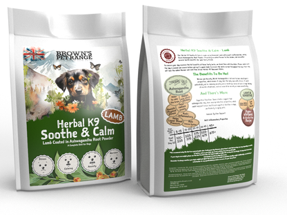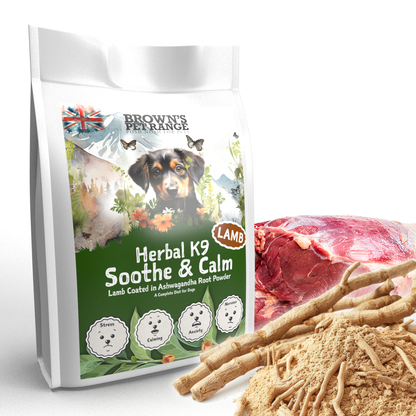 Our Herbal K9 Soothe & Calm is made using Seasoned Lamb with expert craftsmanship, using fresh Ashwagandha Root Powder. Providing an added flavour to the Lamb, but also offer several health benefits for your furry friend.