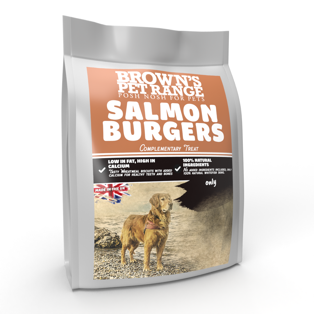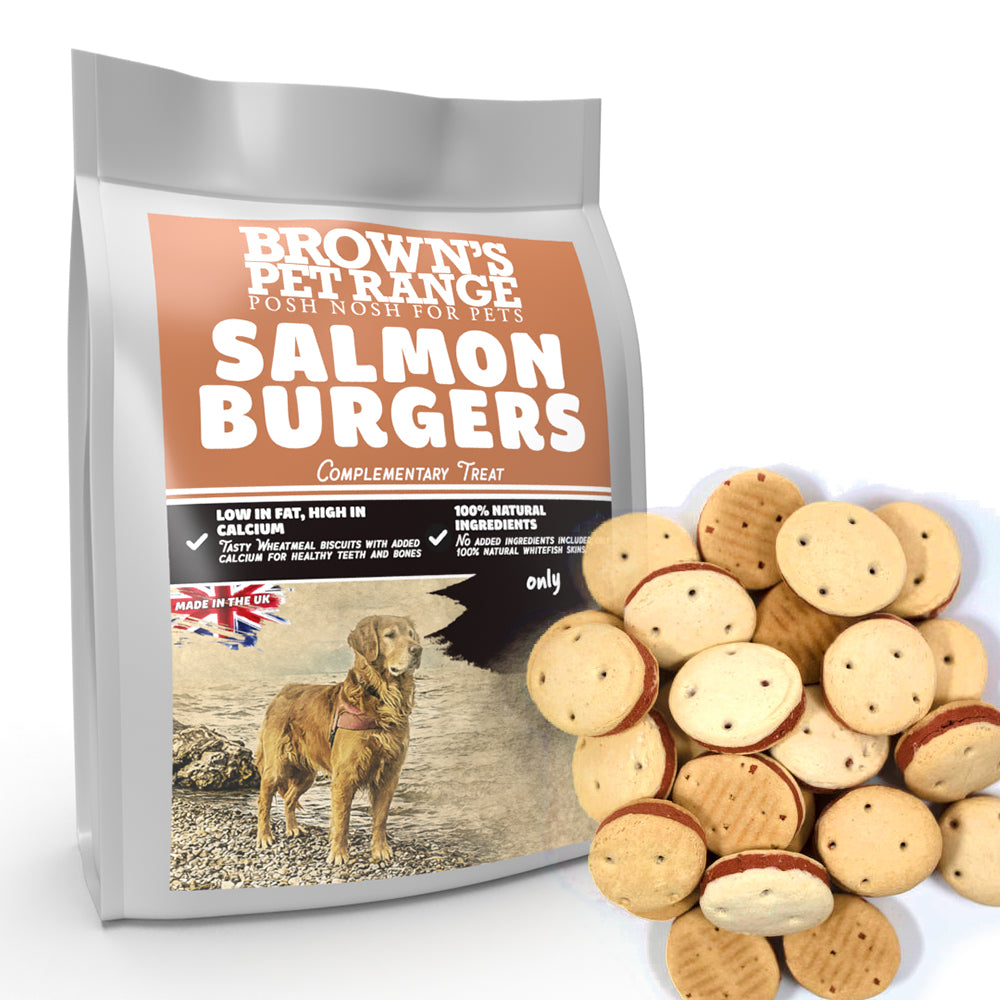 Brown's Salmon Burgers are tasty wheatmeal dog biscuits with added calcium for healthy teeth and bones. Naturally oven-baked dog treat. A complementary pet food for dogs.