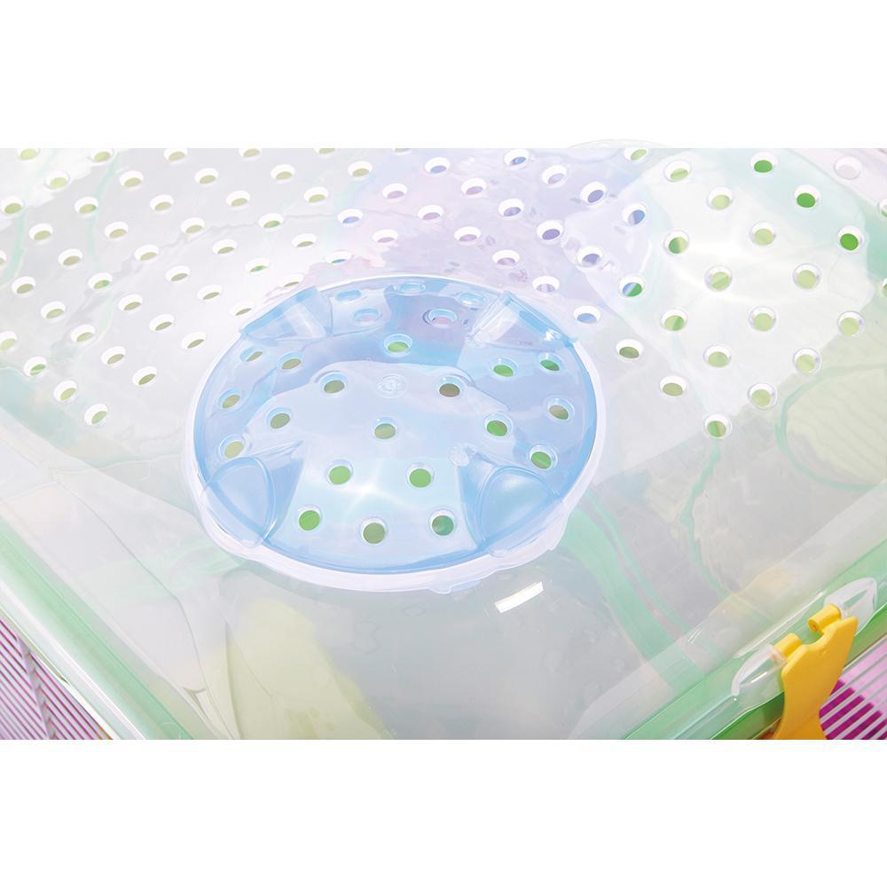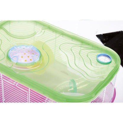 Keep your pet happy and comfortable with the Fantasy Hamster Cage. This spacious cage is a great home for your furry little friends, from hamsters to gerbils. The cage has plenty of space for your small pet to burrow, forage and tunnel and your pet can stay hydrated with easy access to their water bottle. The cage is split into two layers with holes and a tube for them to crawl through, and a wheel to keep them healthy and active. This cage is easy to clean as the lid clips off and there is a smaller gate at the side so you can pick up your pet whenever you want. The bright, vibrant design will bring a splash of colour to your pet's home and the metal bars will let you watch them having the time of their life!